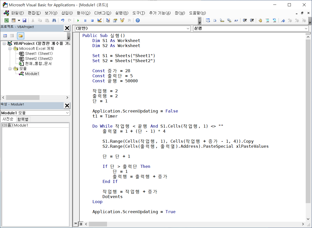 Do While 작업행 < 끝행 And S1.Cells(작업행, 1) <> ""