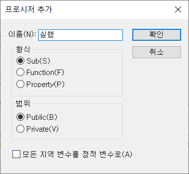 [삽입]-[모듈]을 선택해 모듈을 추가하고, [삽입]-[프로시저]를 선택해 실행 프로시저를 만듭니다.