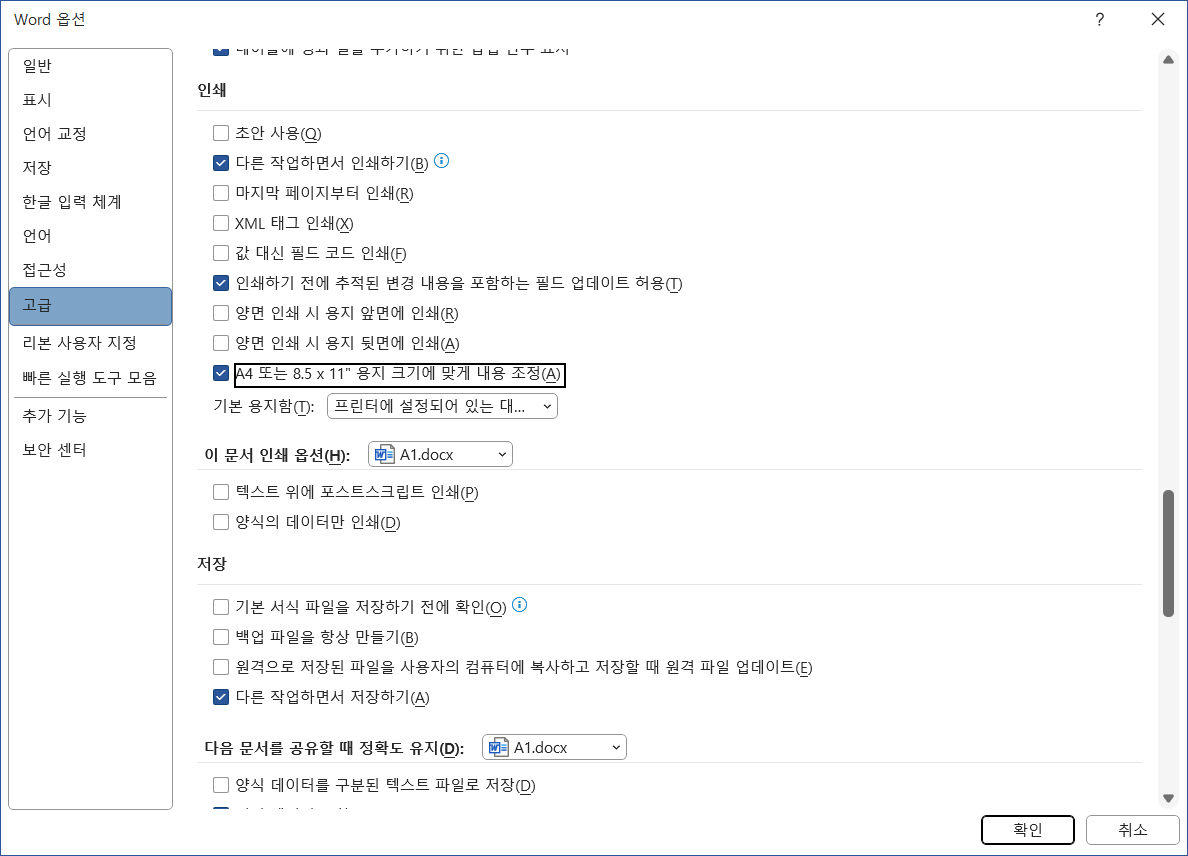 엑셀과 워드는 [A4 또는 8.5 × 11" 용지 크기에 맞게 내용 조정] 옵션을 해제하면 사용자가 지정한 용지로 PDF가 만들어 집니다.