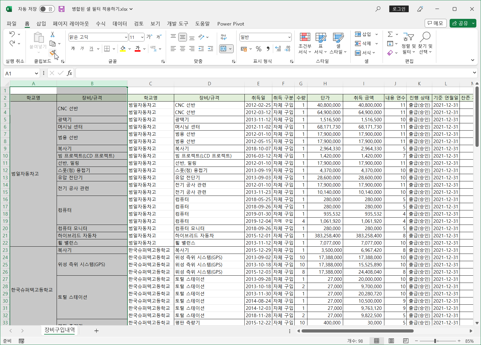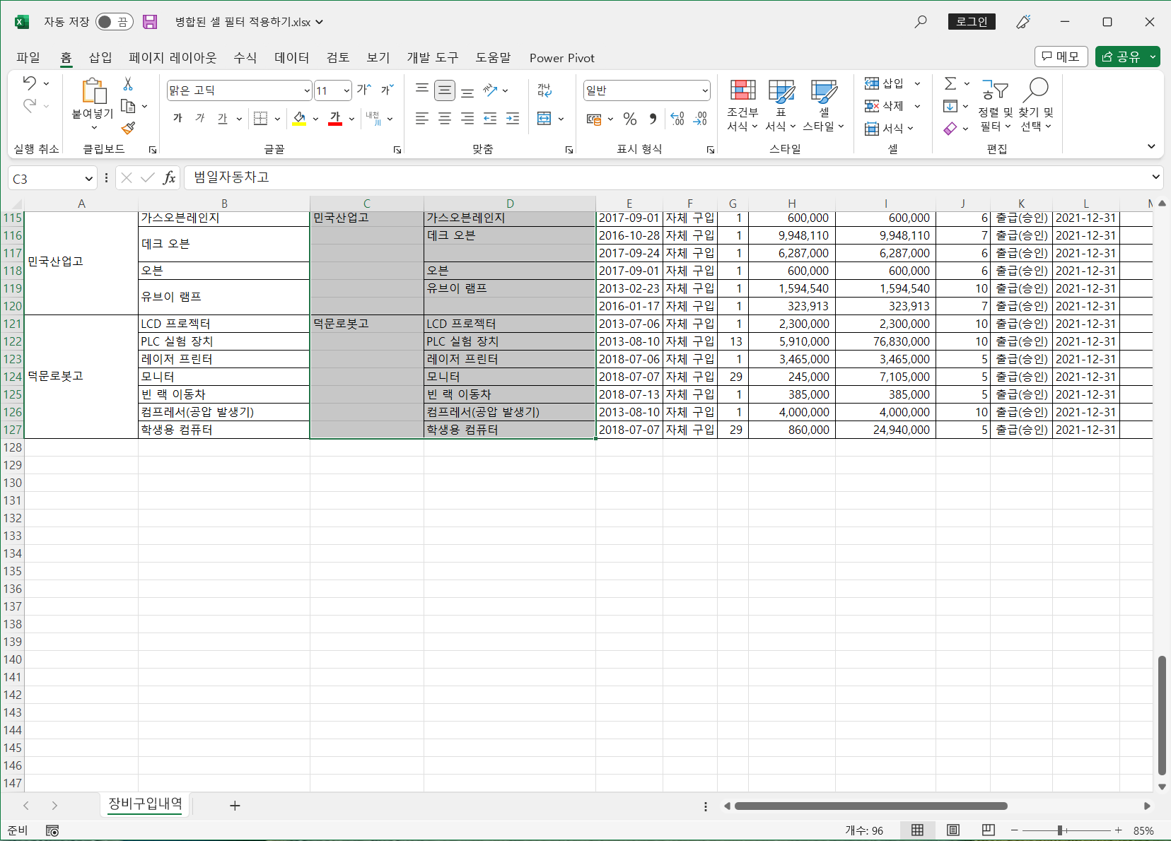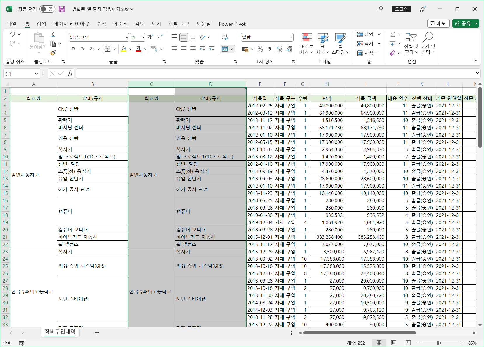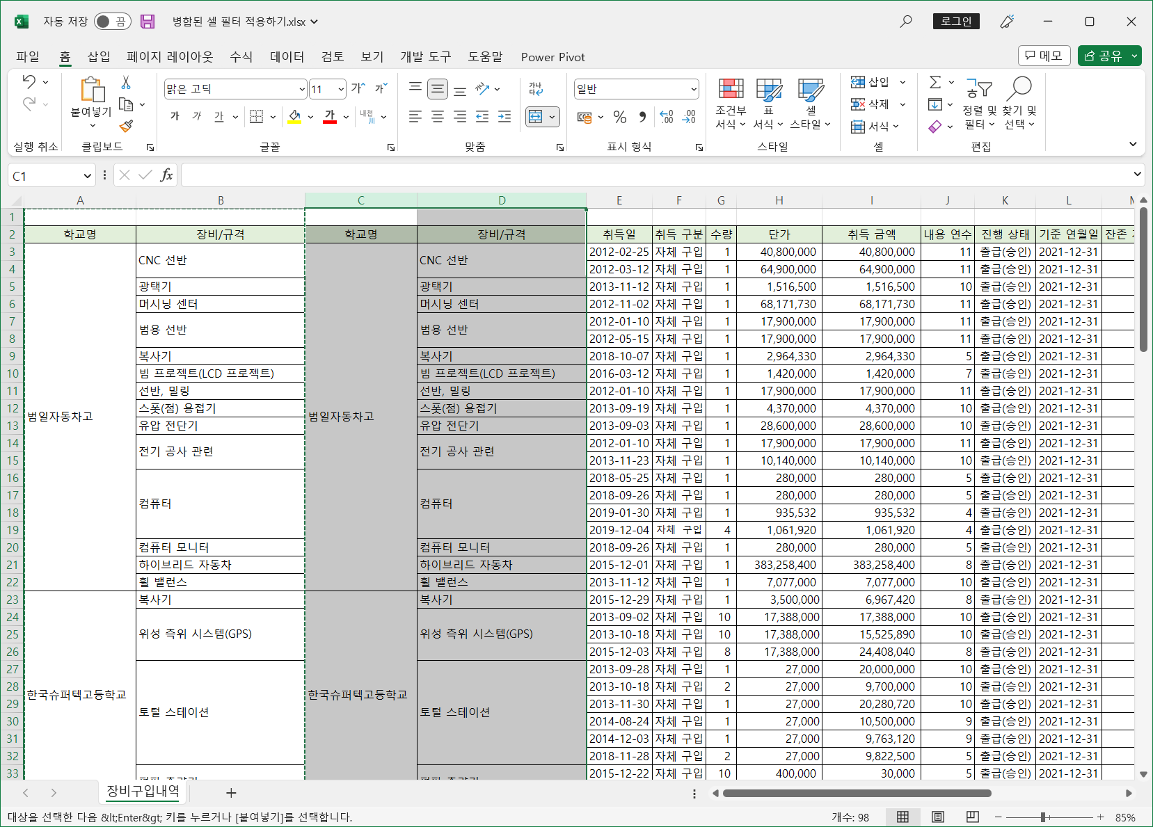 이렇게 병합된 셀은 필터를 적용하면 병합된 범위의 첫번째 셀만 나타나고 나머지는 값이 없어 표시되지 않습니다.