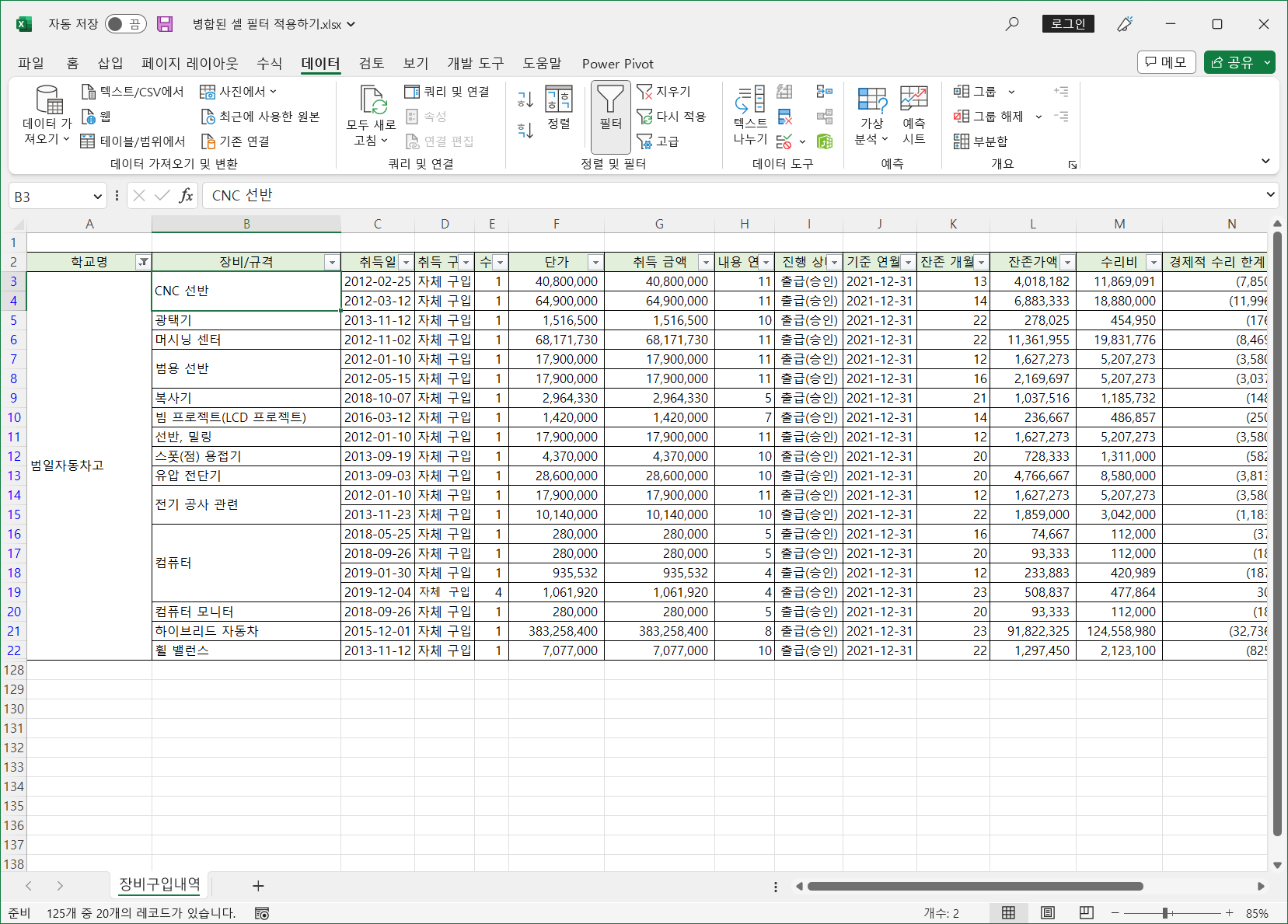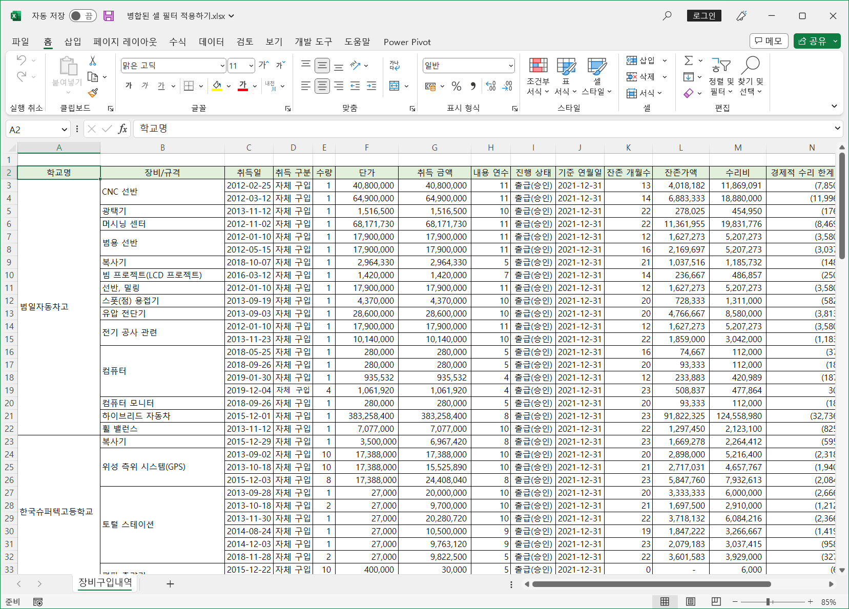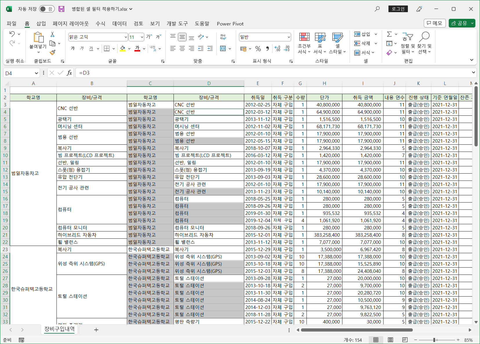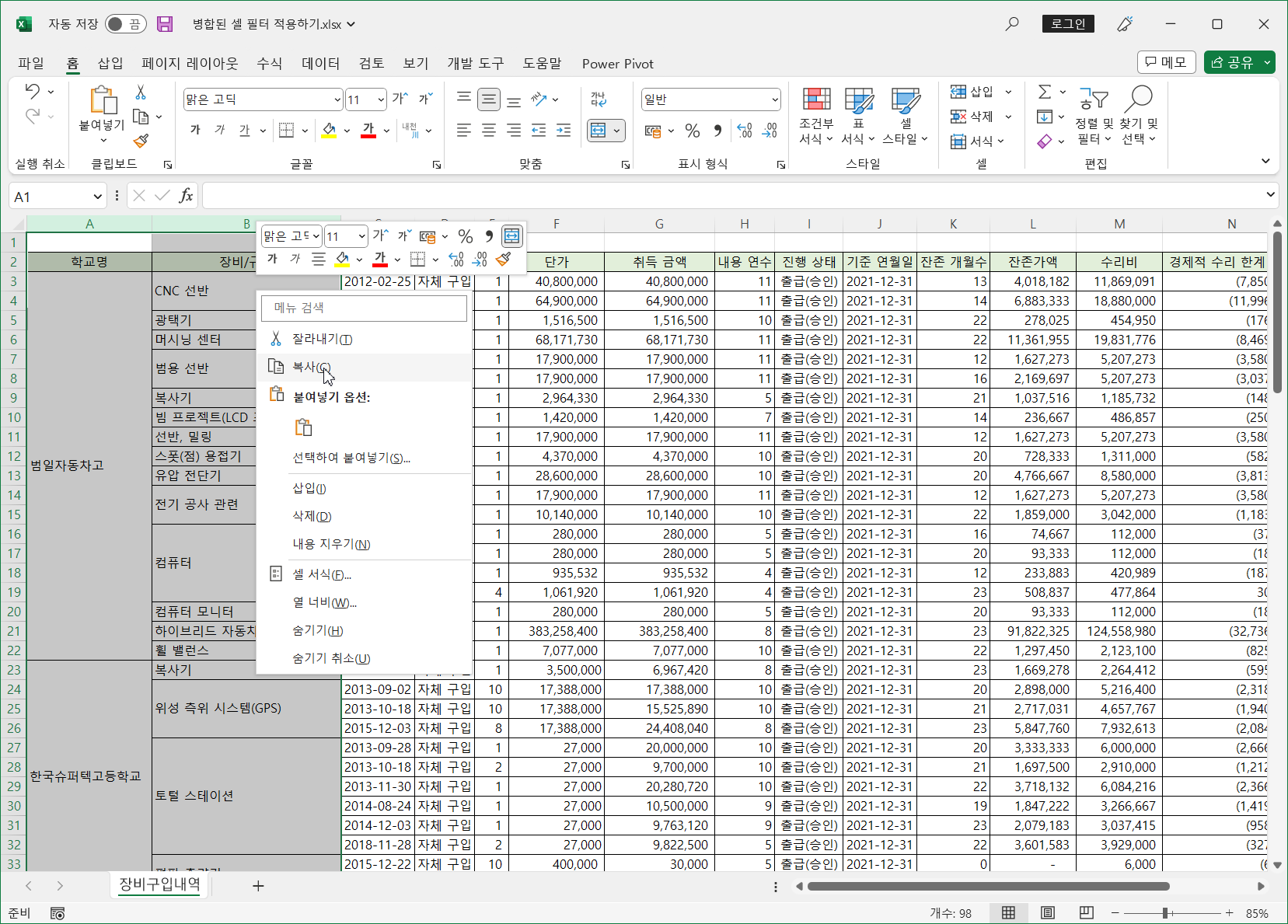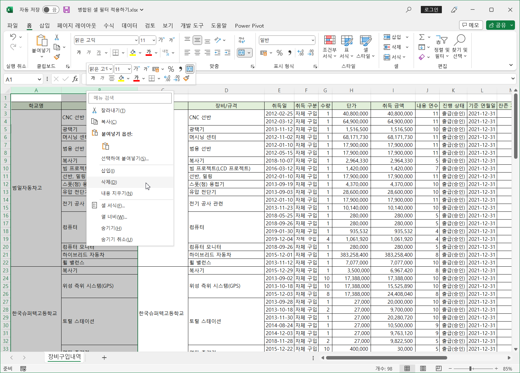 이렇게 병합된 셀은 필터를 적용하면 병합된 범위의 첫번째 셀만 나타나고 나머지는 값이 없어 표시되지 않습니다.