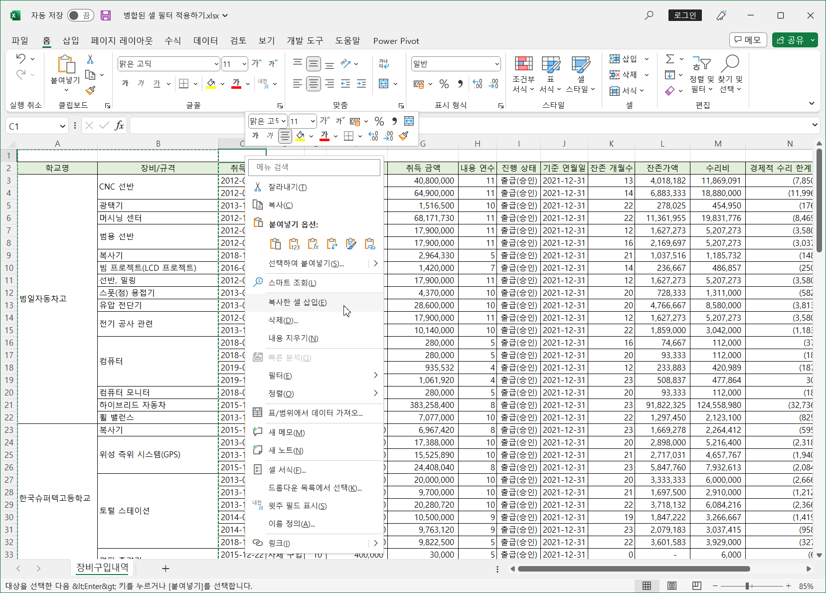 [C1] 셀을 선택하고 마우스 오른쪽 단추를 눌러 [복사한 셀 삽입]을 선택합니다.