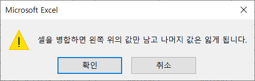 원래 셀을 병합하면 병합하려는 범위의 첫번째 셀 값만 남겨두고 나머지 셀의 값은 모두 없앱니다.