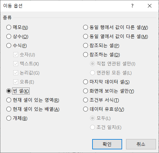 '빈 셀'을 선택하고 [확인]을 누릅니다.