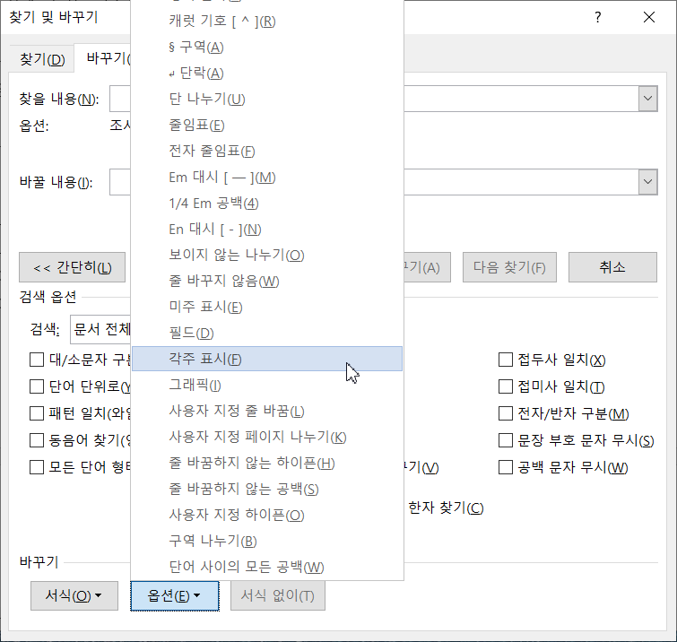 옵션 항목 중 '미주 표시'도 있습니다.