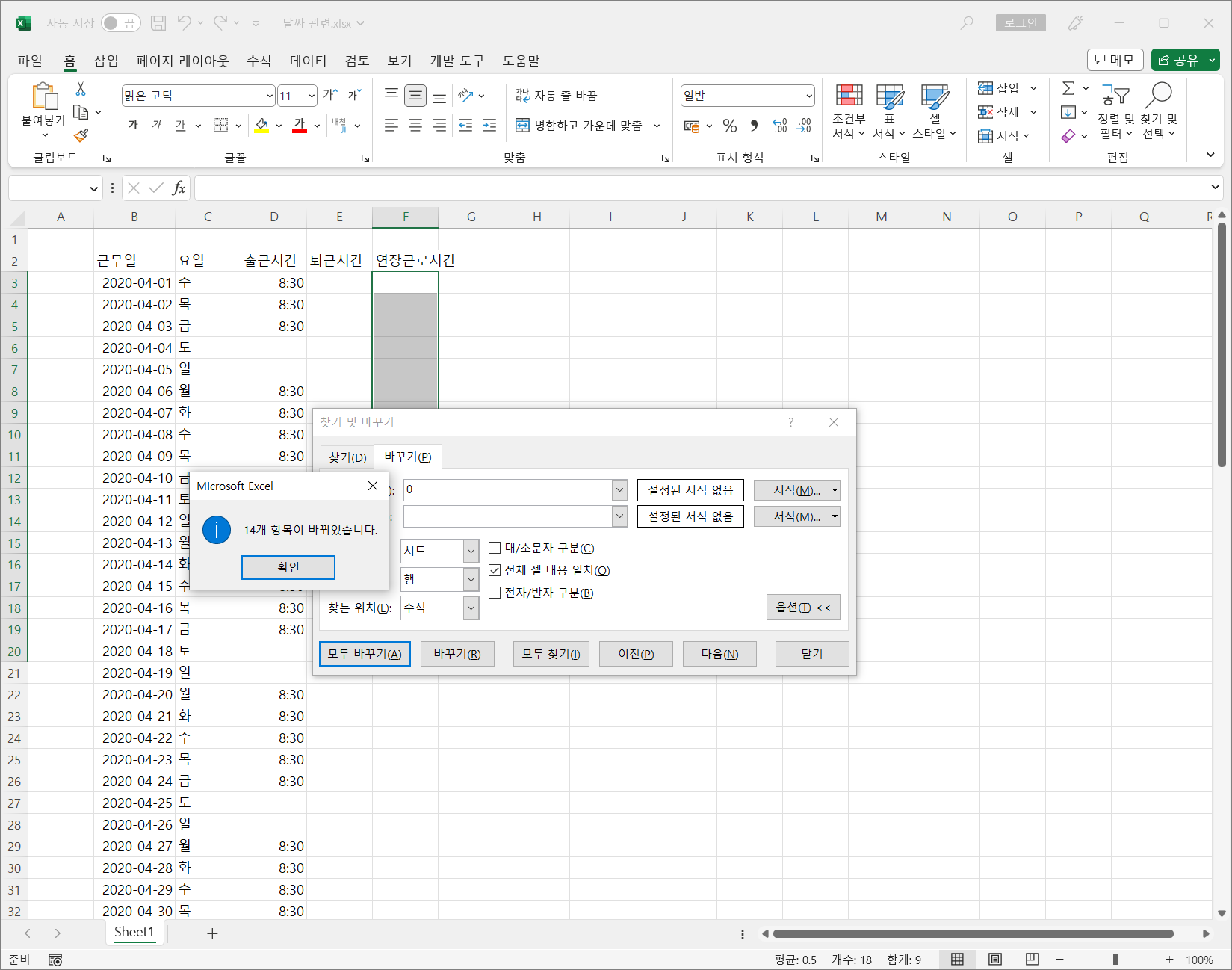 '전체 셀 내용 일치'에 체크하고 [모두 바꾸기]를 클릭합니다.