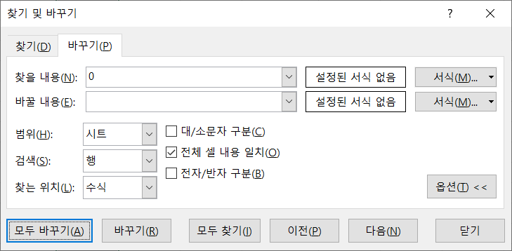 '찾을 내용'에 0을 입력하고, '바꿀 내용'은 비워 둡니다.