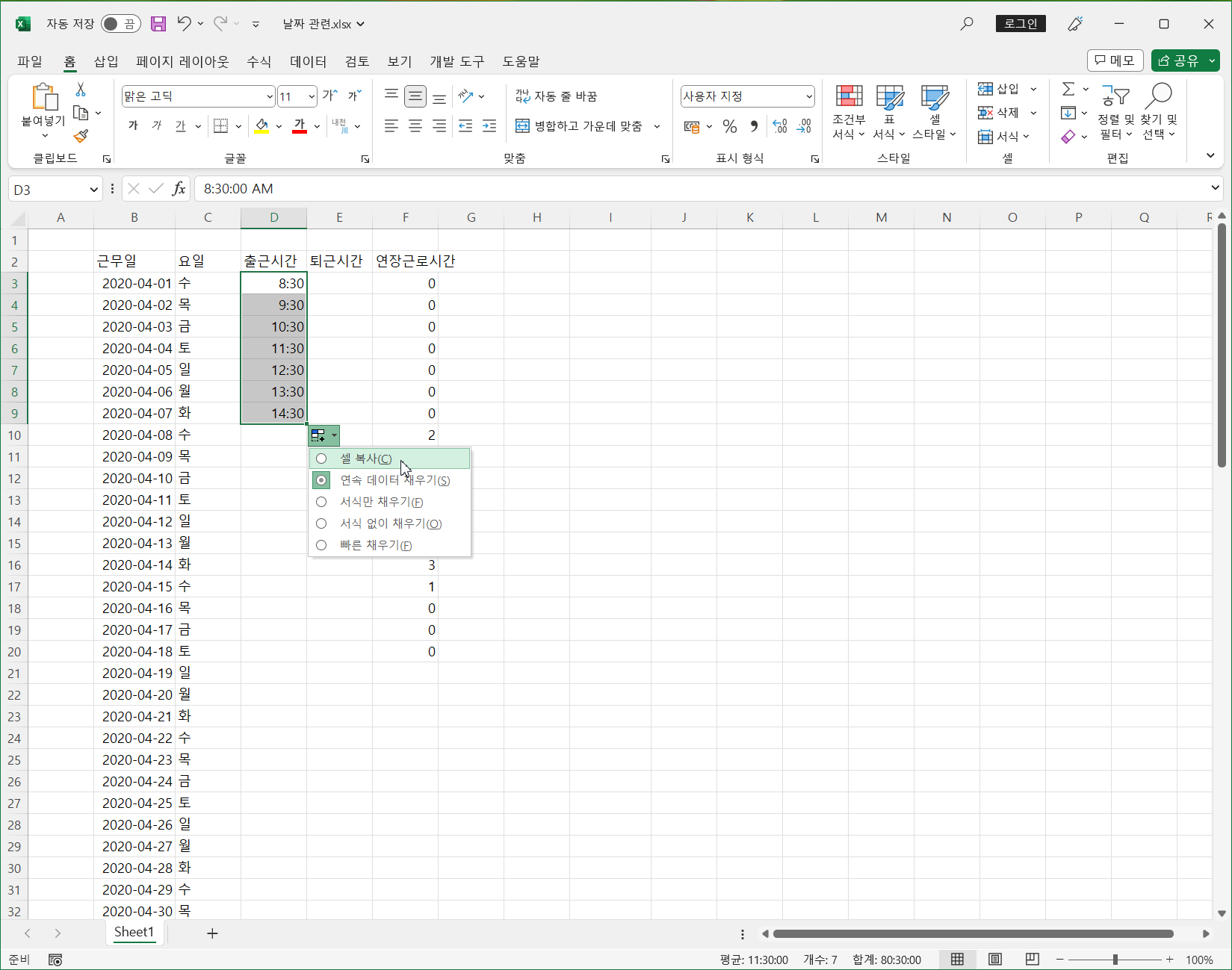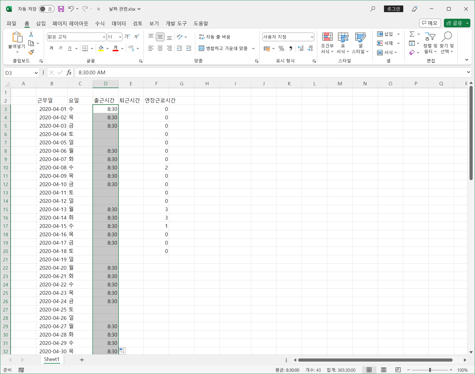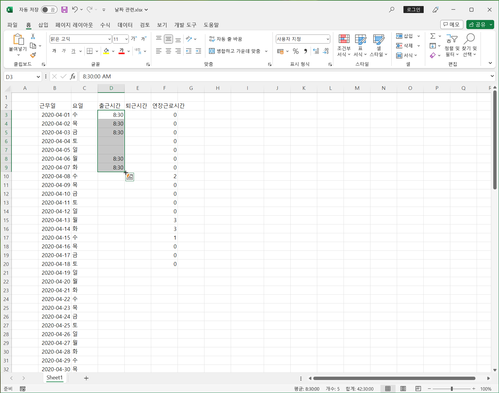 이제 첫 번째 문제인 출근시간에 토, 일을 제외하고 8:30을 입력하는 것입니다.