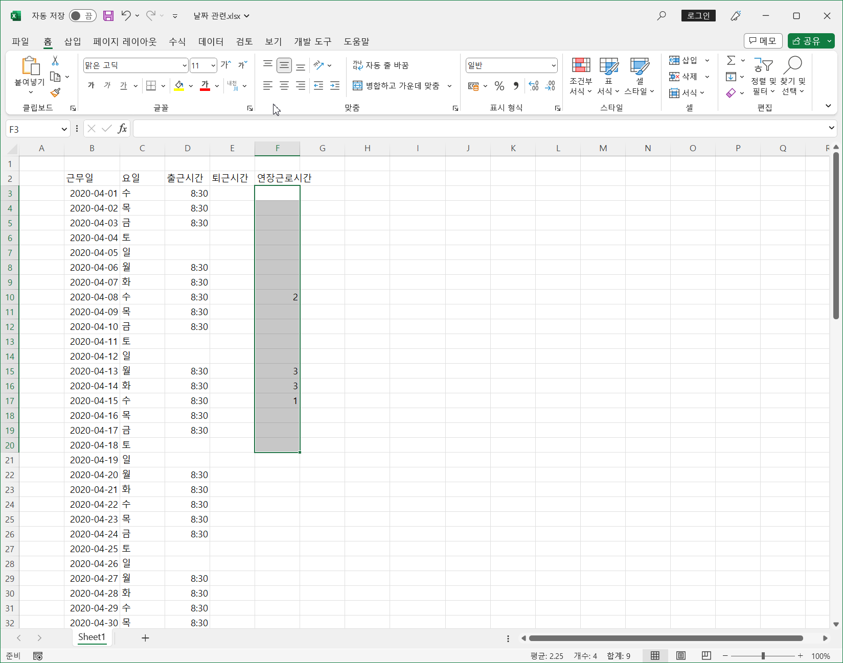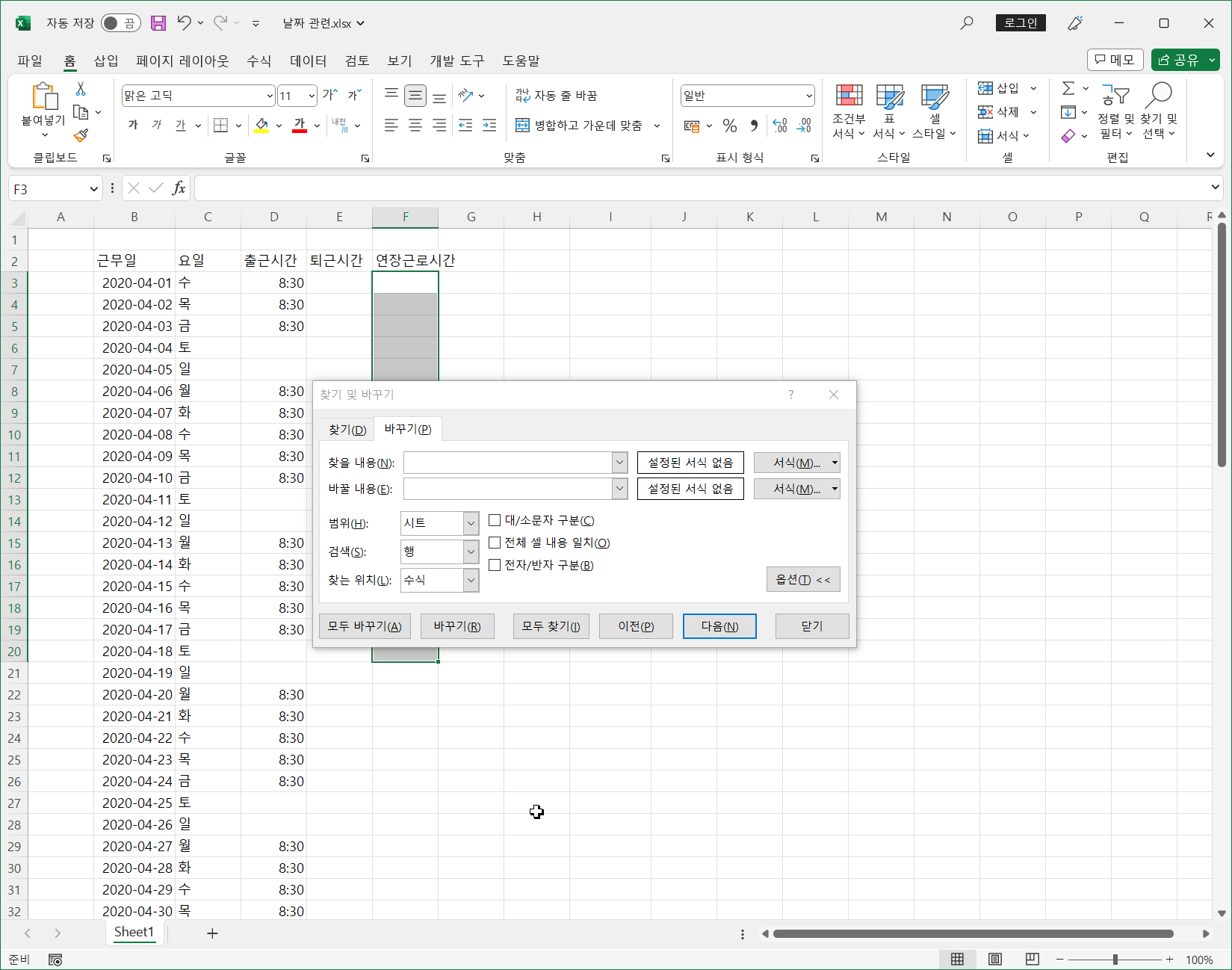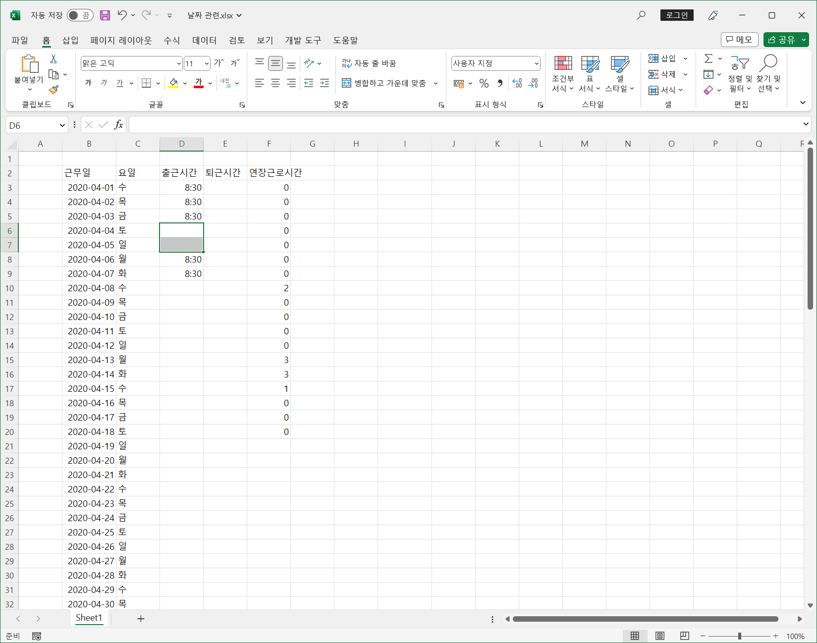 이제 첫 번째 문제인 출근시간에 토, 일을 제외하고 8:30을 입력하는 것입니다.