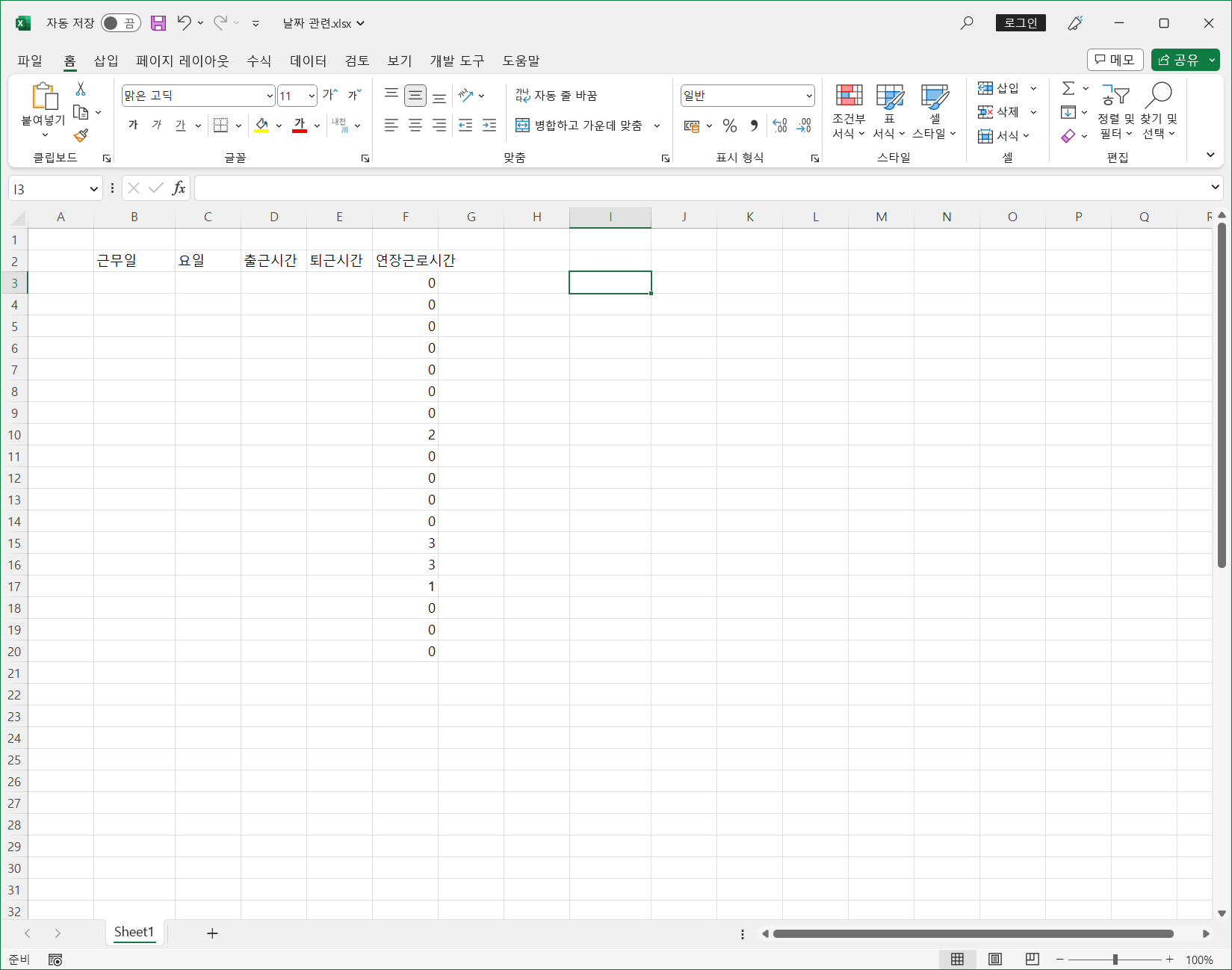 2. 연장근로시간 중 '0'만 골라서 지우거나 표시 안되도록 하고 싶습니다.