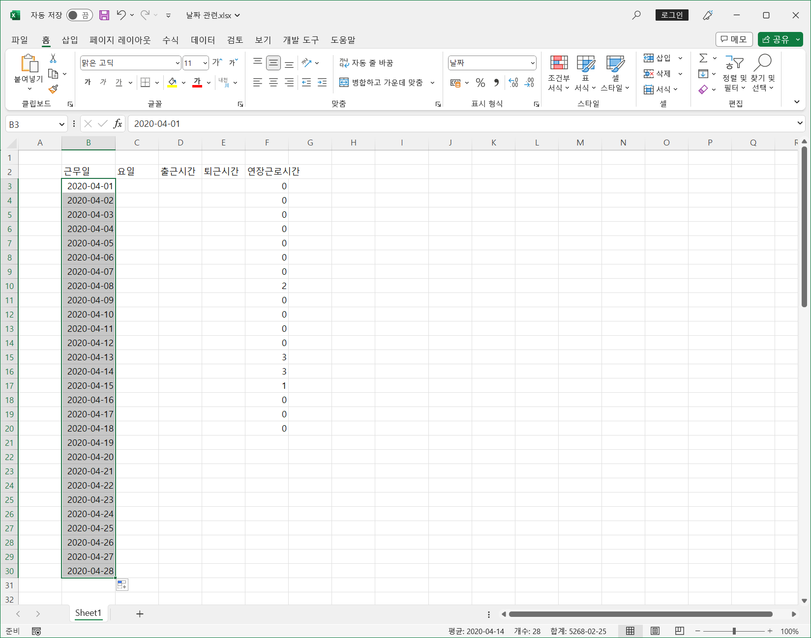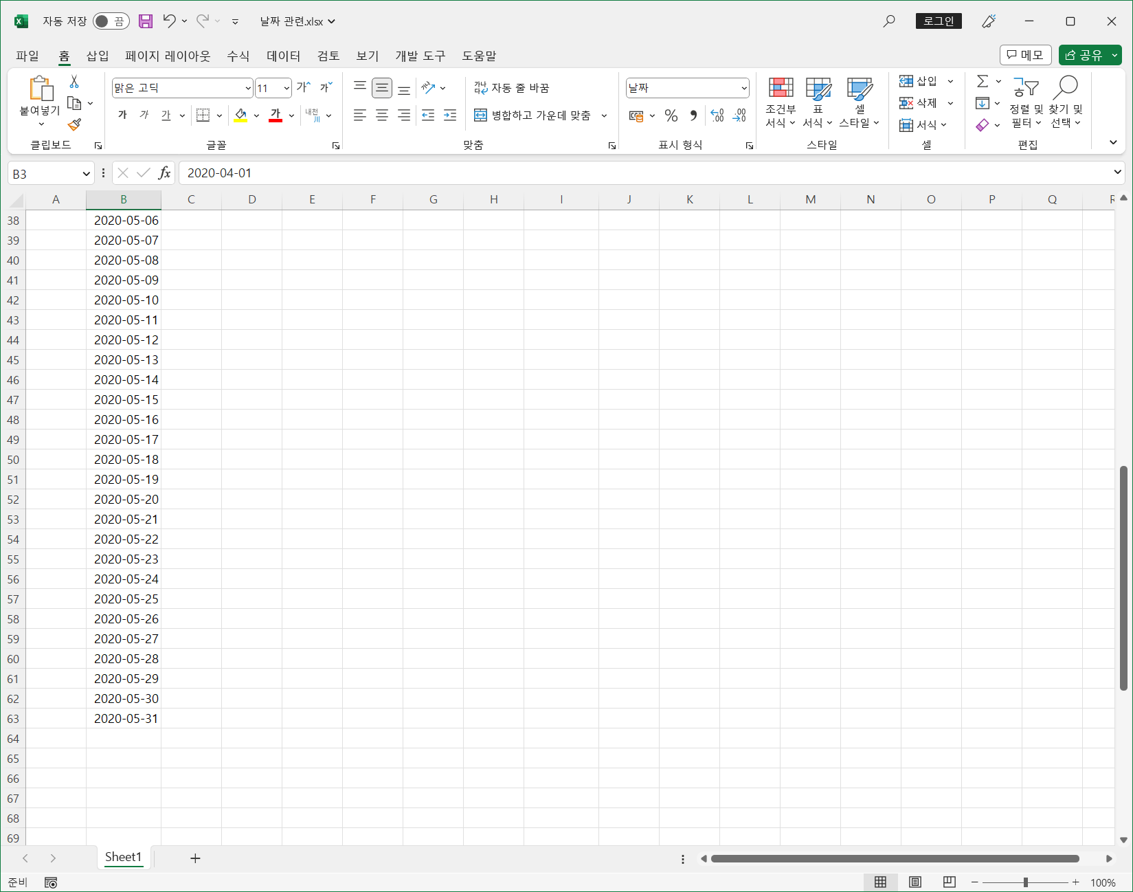 다시 [B3] 셀에 2020-04-01을 입력하고 [홈] 탭 - [편집] 그룹 - [채우기] - [계열]을 선택하거나 단축키 <Alt, H, F, I, S>를 누릅니다.