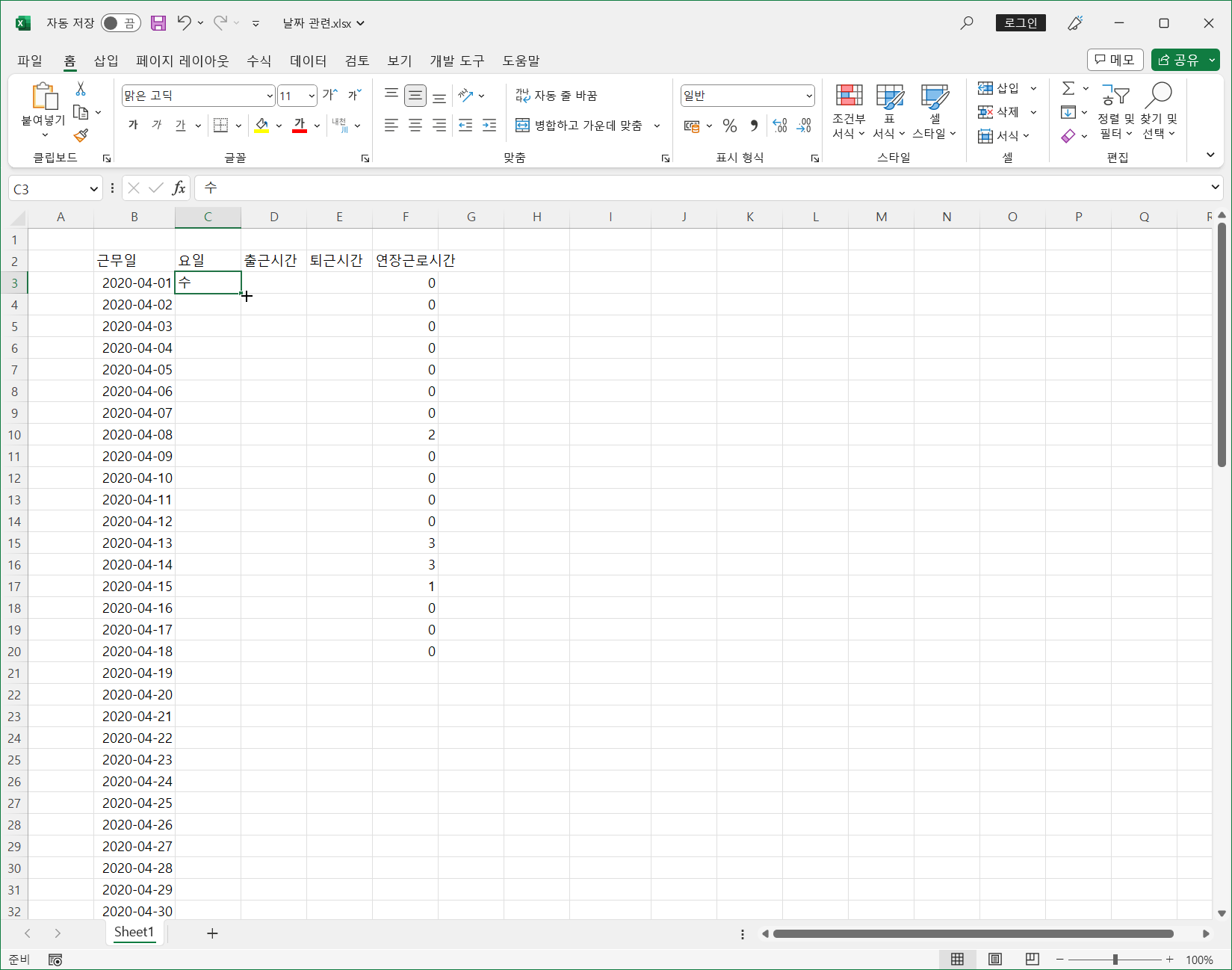 요일은 사용자 지정 목록에 등록되어 있어 하나의 항목만 입력하고 채우기 하면 자동으로 입력됩니다.