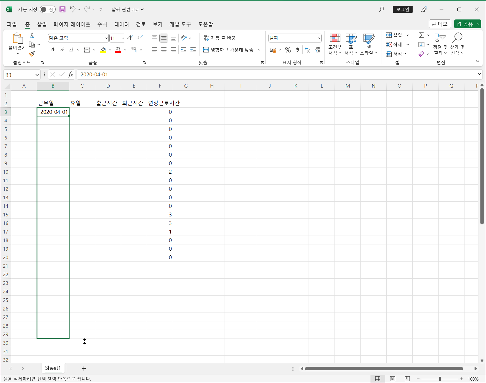 다시 [B3] 셀을 선택하고 <Ctrl + Shift + ↓>를 눌러 빠르게 범위를 선택한 후 <Delete>를 눌러 앞서 채운 날짜를 모두 지웁니다.