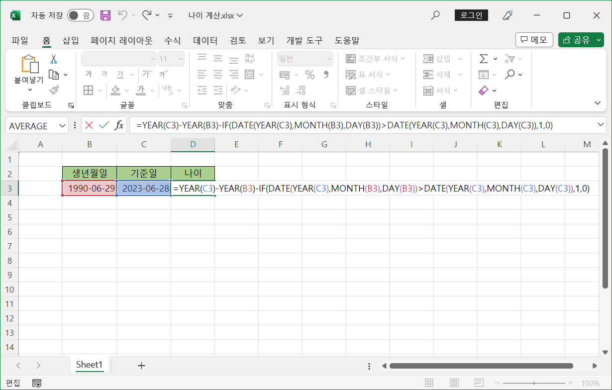 [B3] 셀에 생년월일, [C3] 셀에 기준일이 있습니다.
