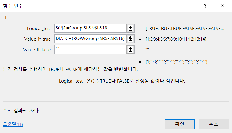 IF 함수의 첫번째 인수에서 비교여부를 확인해서 비교 값과 일치하는 경우 IF 함수의 두번째 인수에 입력된 MATCH 함수로 몇 번째 위치에 있는지 찾습니다.