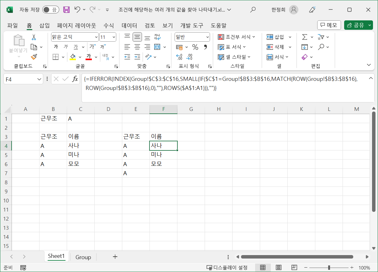 결과로 나타날 수 있는 값이 최대 4개여서 [E4:E7] 셀 범위에 찾는 근무조가 나타나도록 수식을 만들었고, [F4] 셀에 수식을 작성한 뒤 [F7] 셀까지 채우기를 했습니다.