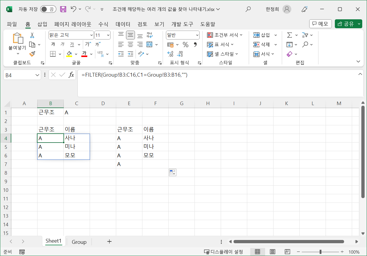 FILTER 함수는 배열 함수여서 [B4] 셀에 수식을 작성하면 조건에 해당하는 값을 가져와서 [B4] 셀부터 표시합니다.