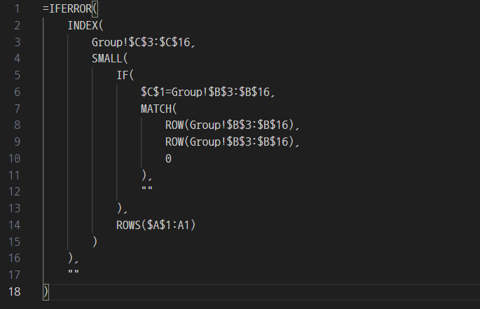 =IFERROR(INDEX(Group!$C$3:$C$16,SMALL(IF($C$1=Group!$B$3:$B$16,MATCH(ROW(Group!$B$3:$B$16),ROW(Group!$B$3:$B$16),0),""),ROWS($A$1:A1))),"")