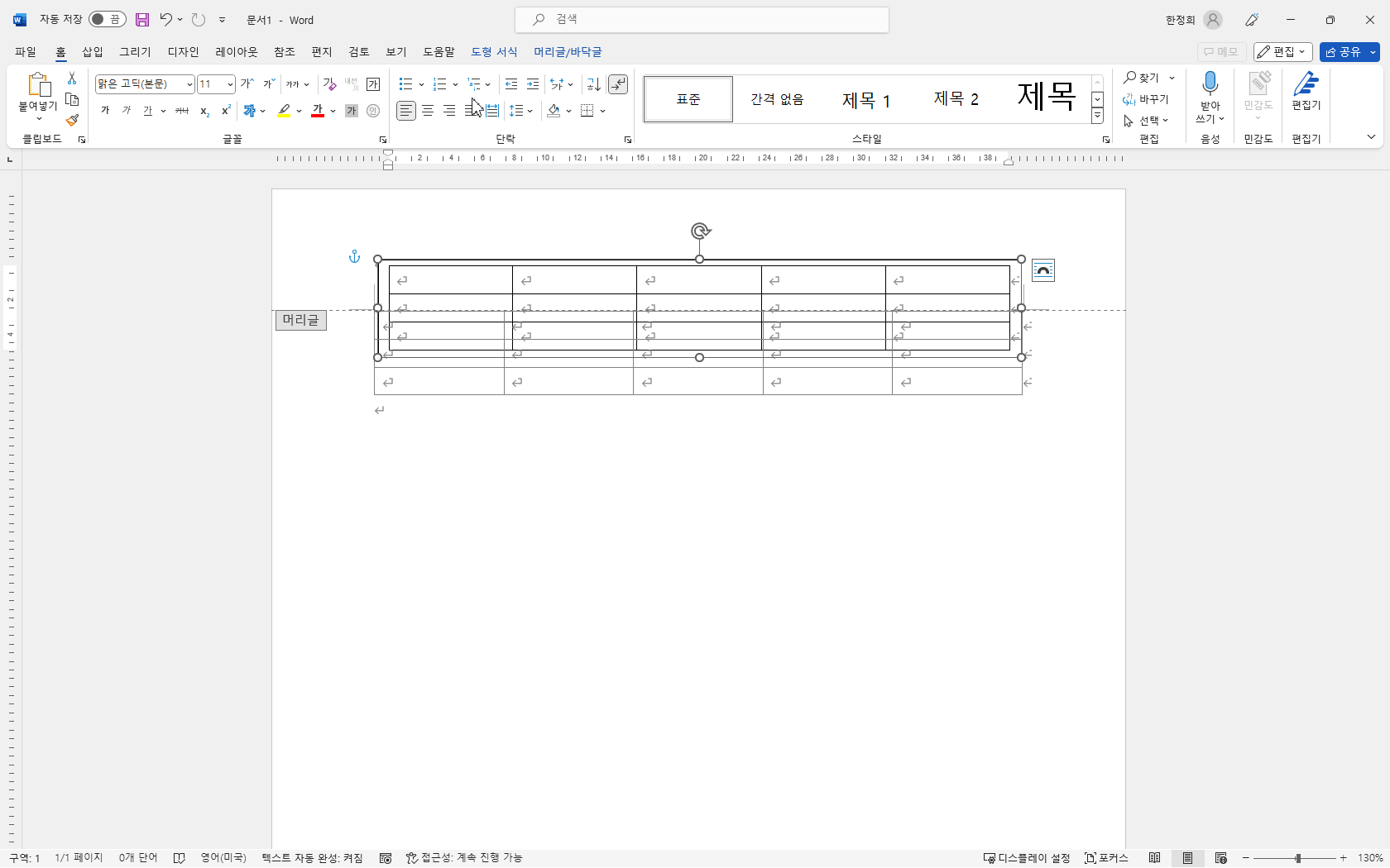 머리글에 5열 3행 표를 삽입합니다.