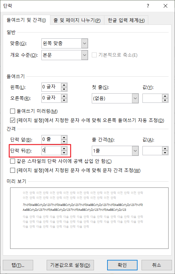 단락 뒤 간격을 0으로 설정합니다.