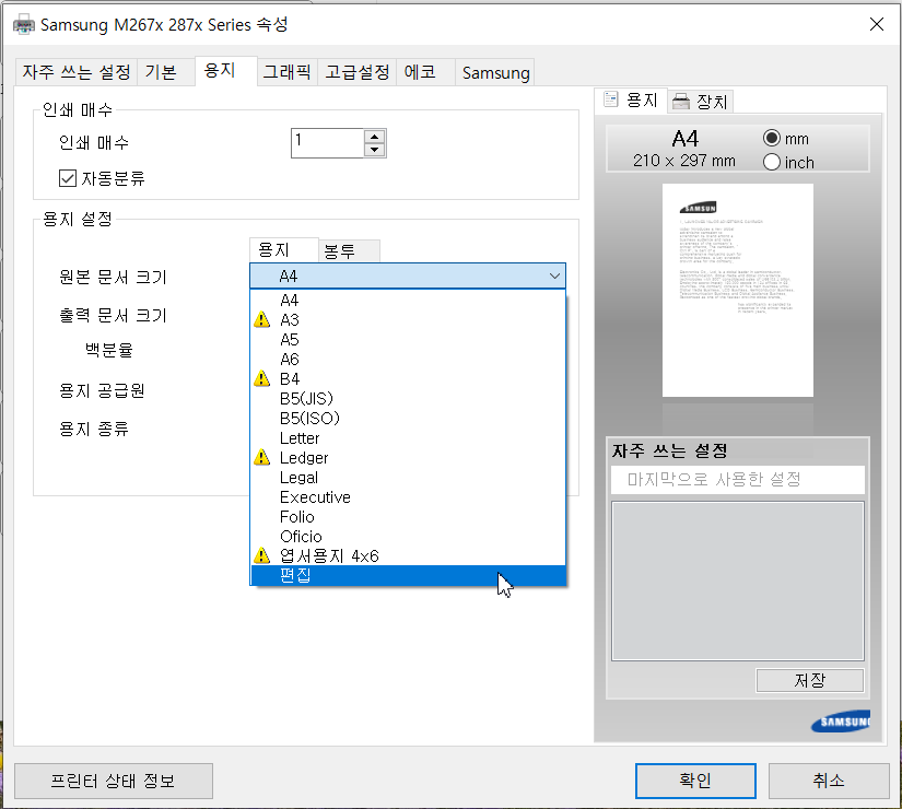 [용지 크기]에 표시되는 항목은 Windows에서 기본 프린터로 선택된 프린터에 등록된 용지 크기들 입니다.