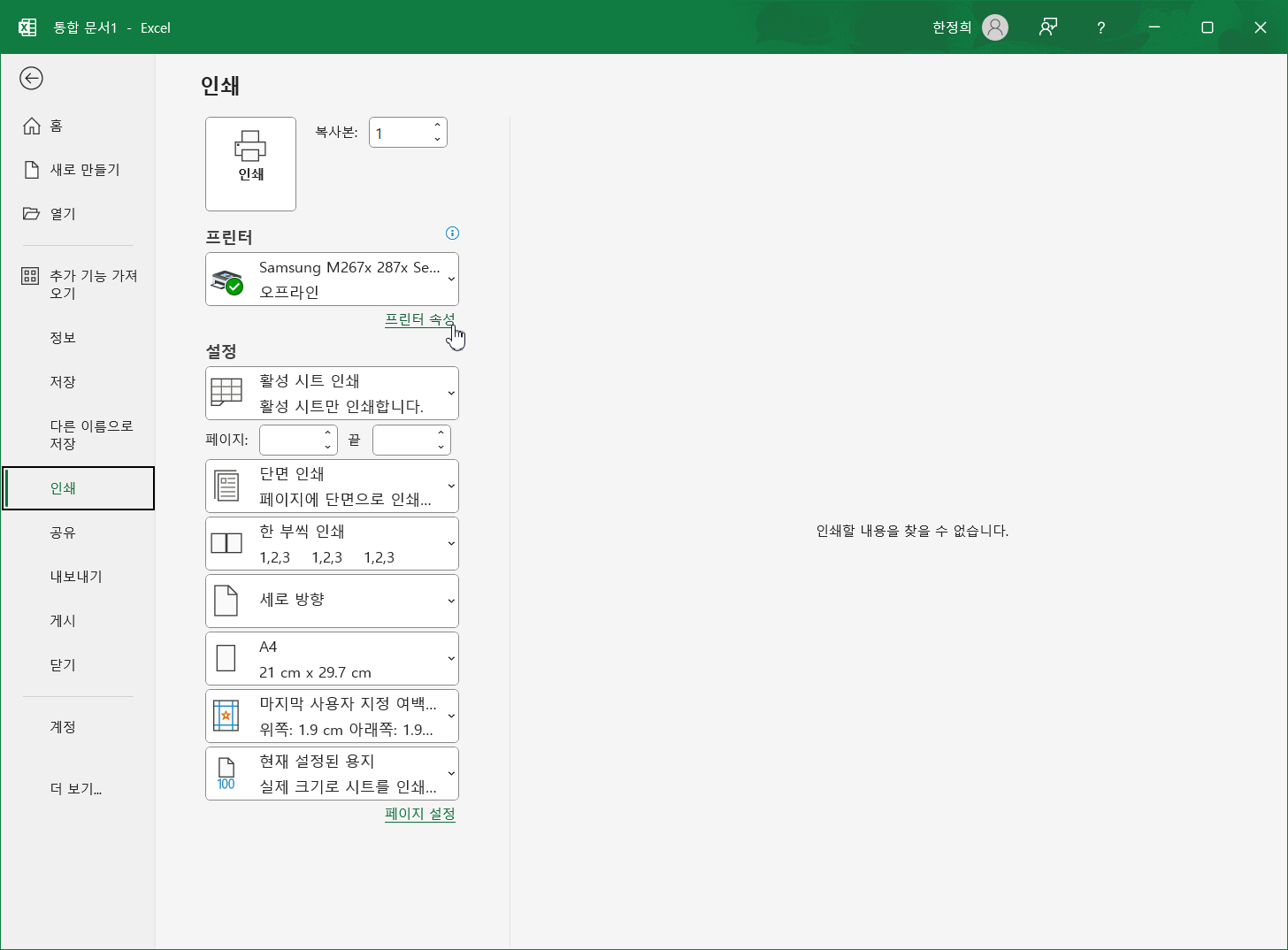 [파일]-[인쇄]-[프린터 속성]을 선택합니다.