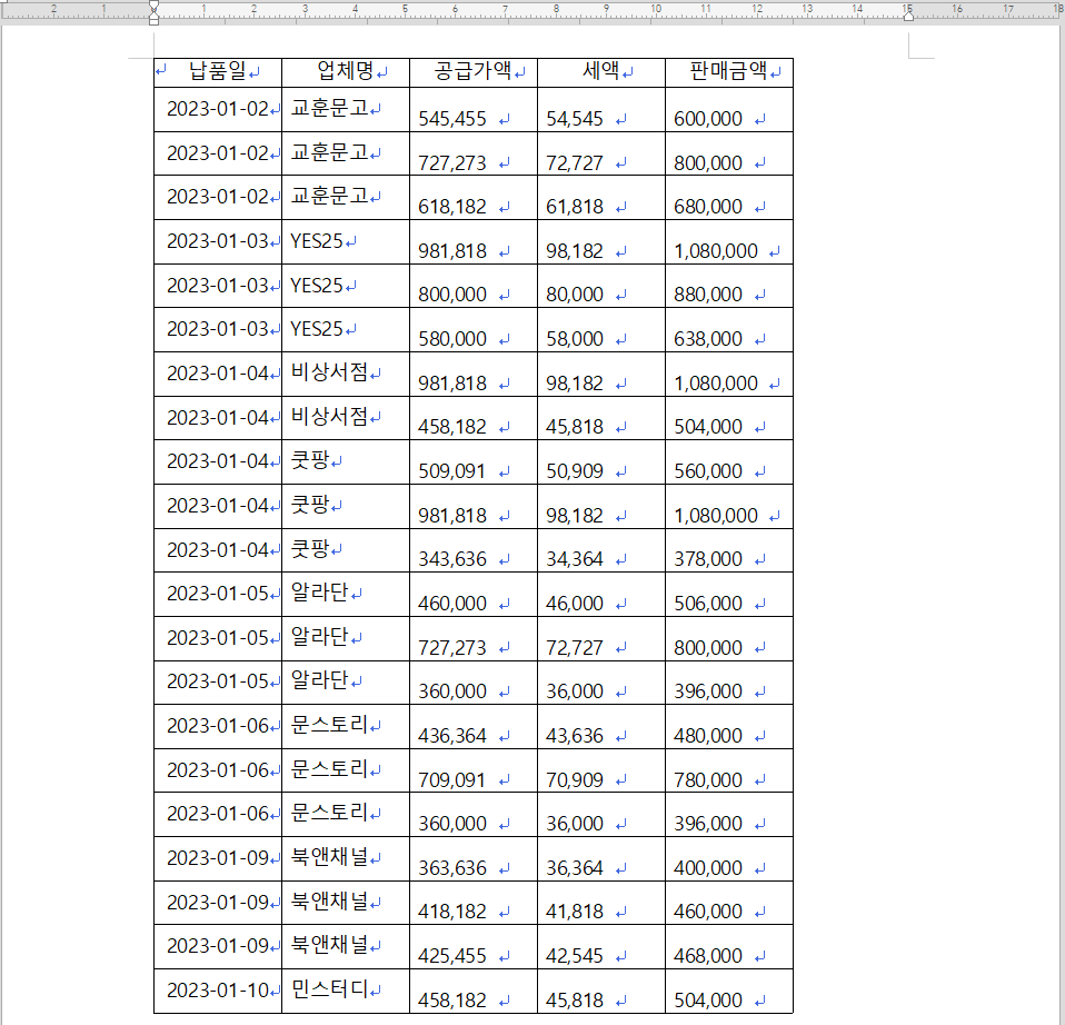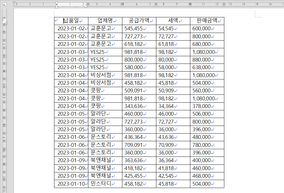 2. 공급가액, 세액, 판매금액이 셀의 두 번째 줄에 표시됩니다.