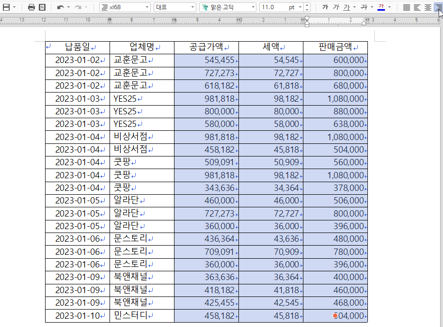 4. 표 크기를 크게 변경하고 숫자는 오른쪽 정렬합니다.