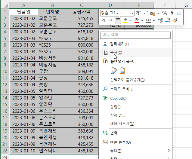 1. 엑셀 워크시트에 작성된 납품 내역 범위를 복사해 한글 문서에 붙여넣습니다.