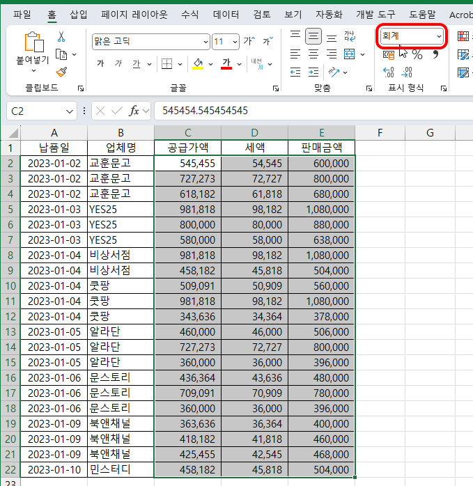 1. 공급가액, 세액, 판매금액 범위를 지정해 [홈] 탭 - [표시 형식] 그룹 - [표시 형식]을 보면 적용된 형식을 확인할 수 있습니다.